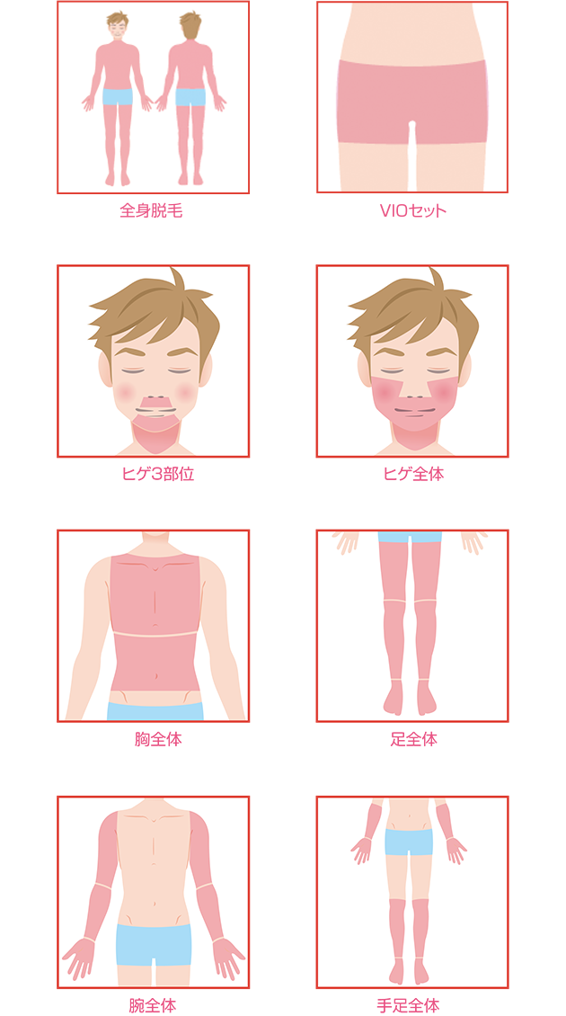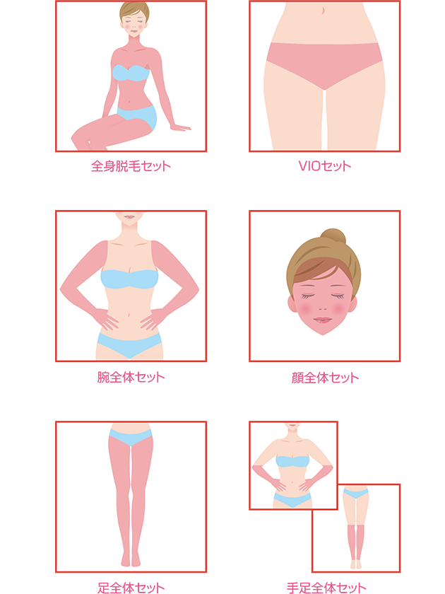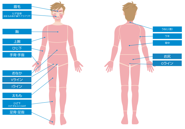| 全身脱毛 | うなじ・両脇・二の腕・ひじ~手首・手の甲と指・胸・乳輪周り・おなか・背中・お尻・太もも・ひざ~足首・足の甲と指 | |